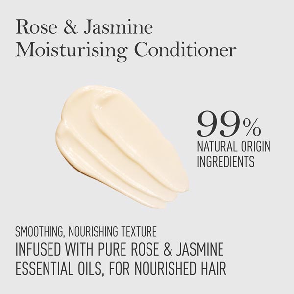 The Rose & Jasmine Moisturising Hair Conditioner has been formulated with this in mind. This lightweight, non-silicone cream formula provides moisture where it is needed most, leaving hair soft, fluid, and responsive to the touch, without being greasy or heavy.